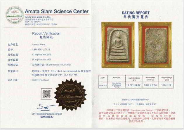 本拍品經過專業性權威機構:‘Amata Siam Science Center’采用“發光測年法”即热释光/光释光&激光烧蚀电感耦合等离子体质谱分析得出準確的確定製作年代。